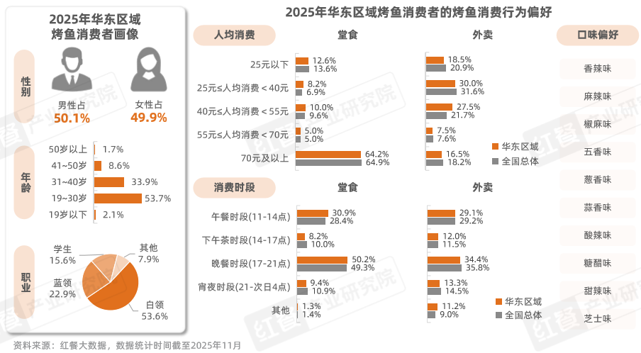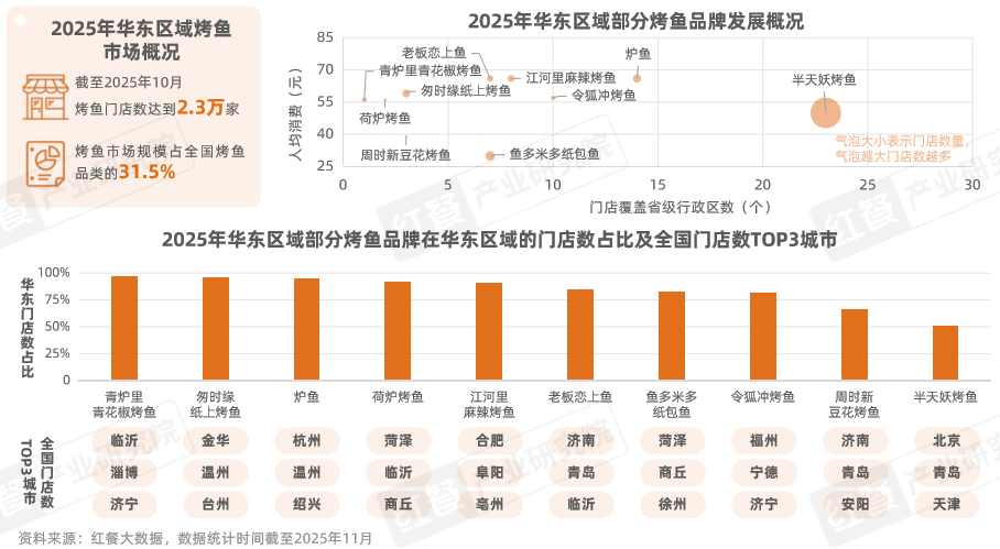 据红餐大数据,截至2025年10月,华东区域烤鱼市场份额占全国的31.5%,烤鱼门店达到2.3万家。以华东区域为主要经营腹地的烤鱼品牌有半天妖烤鱼、炉鱼、老板恋上鱼、令狐冲烤鱼等。