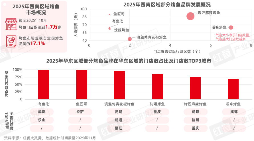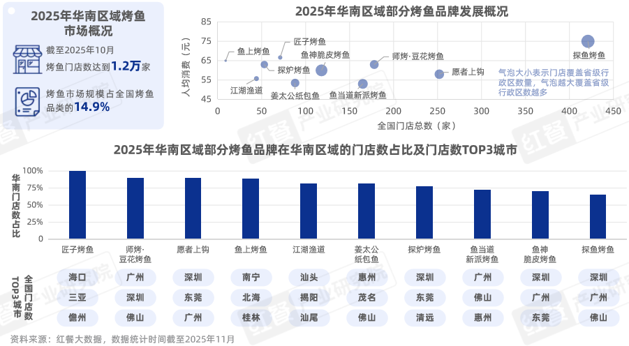 据红餐大数据,截至2025年10月,华南区域烤鱼的烤鱼市场份额占全国的14.9%,烤鱼门店达到1.2万家,并逐步诞生探鱼烤鱼、师烤·豆花烤鱼、愿者上钩等以华南为主要经营腹地的连锁烤鱼品牌。