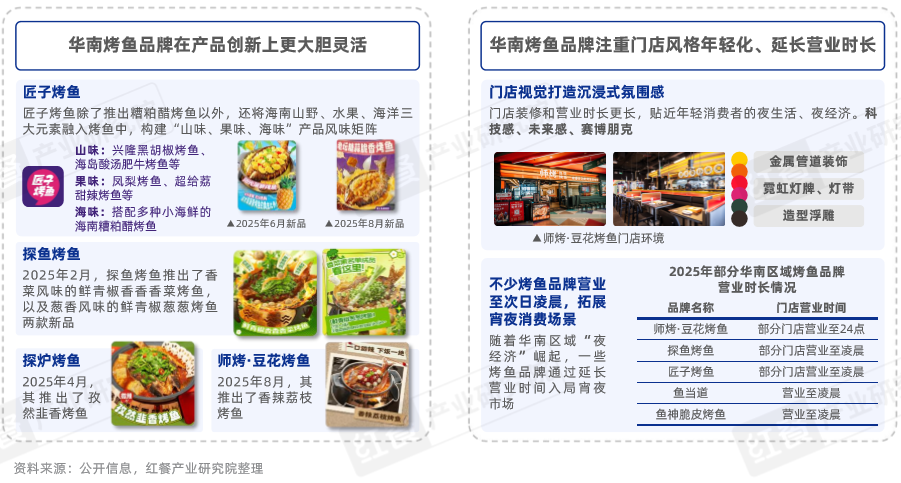 此外,近年来华南烤鱼品牌通过产品创新和门店年轻化策略构筑差异化竞争优势,精准触达年轻消费群体。在产品端口,品牌在口味研发和菜品创意上持续发力,不断尝试跨界融合、创新调味和特色食材应用,形成独特的产品卖点,以满足年轻消费者对新奇、多样化餐饮体验的追求。