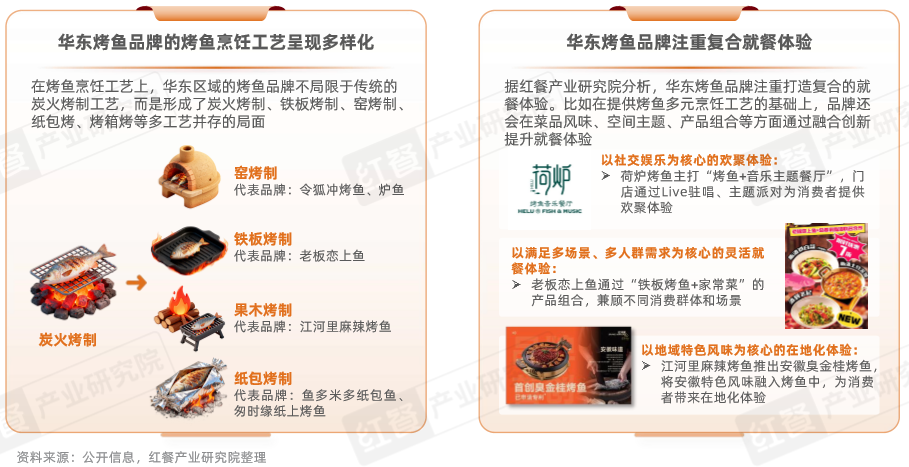 从产品方面来看,华东烤鱼品牌在烹饪工艺上展现出技术多元化的创新趋势,突破了传统炭火烤鱼的单一模式,形成了纸上烤鱼、炉烤、窑烤、铁板烧等多种技法并存的格局。从消费体验的打造上看,华东烤鱼品牌注重为消费者提供复合的就餐体验,通过品类融合、地域风味融合的方式提升就餐体验。