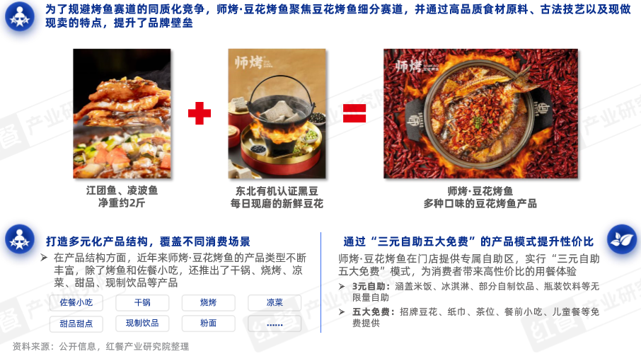 此外,为了给消费者带来更丰富的消费体验,师烤·豆花烤鱼不断丰富菜单结构,形成以烤鱼为核心,干锅、烧烤、凉菜、甜品甜点等为辅的复合产品结构。同时,师烤·豆花烤鱼通过“三元自助五大免费”的产品增值服务,提高品牌性价比。
