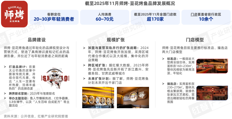 据红餐大数据,截至2025年11月,其全国门店数超过170家,覆盖省级行政区10余个,覆盖城市近40个。并随着品牌持续发展,师烤·豆花烤鱼形成了标准店、臻选店两大门店模型。