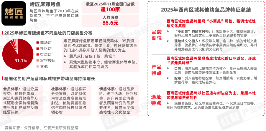 烤匠作为西南区域表现突出的烤鱼品牌,其主打川渝经典麻辣口味,并以Z世代为核心消费群体,通过精细化的用户运营,近年来受到消费者及行业内广泛关注。据红餐大数据,截至2025年11月,其全国门店数超过100家。除烤匠之外,大多数西南烤鱼品牌普遍呈现小而美、地域化、烟火气强的本地化经营模式特征。