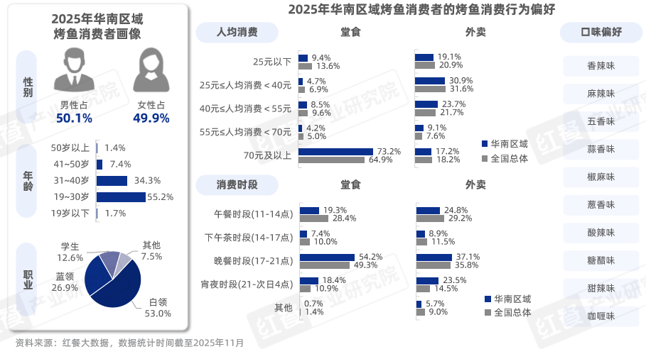 烤鱼消费行为方面,华南烤鱼消费者在烤鱼堂食的人均消费更集中于70元及以上,占比达到73.3%;而外卖的人均消费水平与全国总体大致相同。此外,华南区域的烤鱼消费在夜间更为活跃,在晚餐、宵夜时段消费的占比均高于全国总体水平。口味偏好上,虽然香辣、麻辣口味的偏好度较高,但五香、蒜香等非辣味型同样广受华南烤鱼消费者欢迎。
