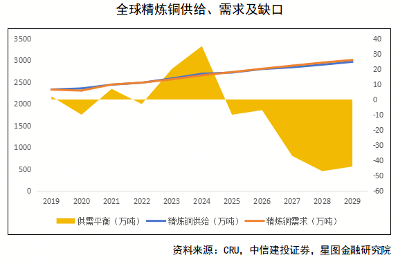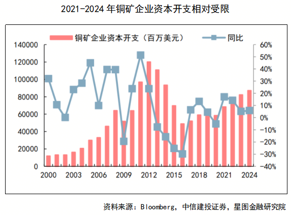 由于政策不确定性和融资利率上升,资本开支对高铜价的响应受到明显抑制,使得铜精矿短期供给增长受限。通常铜矿山从完成可行性研究到进入建设准备阶段平均需时约2年,从开工建设到最终投产又需约3年,因此铜精矿供给往往滞后于资本开支5年左右。据此推断,2026年铜精矿的供应实际上主要取决于2021年前后的资本开支水平,包括既有矿山的扩建与新矿项目的投产。然而,当时正值美联储启动货币政策正常化进程,海外基准利率上行推升实际利率,导致铜矿企业对新投项目的投资回报要求相应提高。同时,全球产业链和供应链在此期间接连遭受重大冲击,终端需求表现低迷,进一步削弱了铜矿企业增加资本开支的动力。受此影响,2021至2024年间全球主要铜矿的资本开支增长有限,2024年资本开支总额约为872亿美元,仅相当于2013年峰值1109亿美元的79%。这一趋势预示着,直至2030年前,全球铜矿的新增供给能力都将保持相对有限的增长态势。