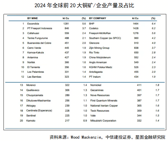 全球铜矿资源与产出均呈现高度集中的格局。从储量分布看,CR5占比56%,其中智利占比20%,澳大利亚占比10%,秘鲁占比10%,刚果金占比8%,俄罗斯占比8%。在产量方面,集中趋势更为明显,CR5占比80%,其中智利占比23%,刚果金占15%,秘鲁占11%,中国与印尼分别占8%和5%。这种集中格局也体现在具体的矿山和企业层面。2024年,全球排名前20铜矿的产量合计占全球总产量的36.6%,而前20家铜矿生产商的产量占比更是达到了56.8%,充分凸显了该行业资源端的高度集中特征。