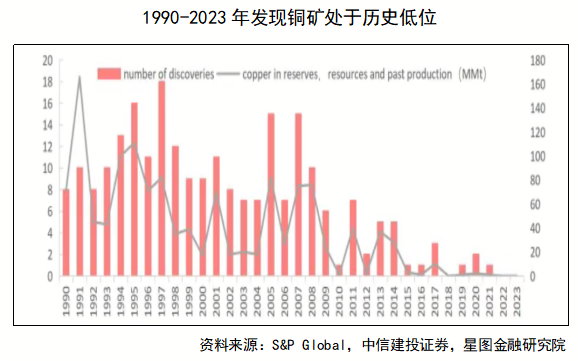 过去勘探预算不足与重大发现稀缺,将在中长期深刻制约铜精矿的潜在增量空间。铜矿开发周期极长,从勘探到投产间隔约为15.7年,这意味着当前产能/产量是矿企在15.7年之前勘探发现的“滞后函数”,勘探预算和重大发现可以用来预测中长期内铜精矿供给潜在的增长空间。尽管全球铜矿勘探预算自2016年低点后有所反弹,2024年恢复至约30亿美元,但仍仅为2012年历史峰值47亿美元的64%。更为关键的是,勘探投入增加并未转化为有效的资源发现。据《近十年全球铜矿勘查形势与找矿进展》显示,2013-2022年是记录以来发现绩效最差的十年,新增14个主矿产为铜矿的含量仅约6.05亿吨(资源量储量加上已知产量),仅占1990年以来发现总量的5.2%,2009年至今的铜增量更是不足1.43亿吨,尚不及1991年单年水平,深刻揭示了全球铜资源储备增长正面临系统性瓶颈,远期供应基础异常薄弱。