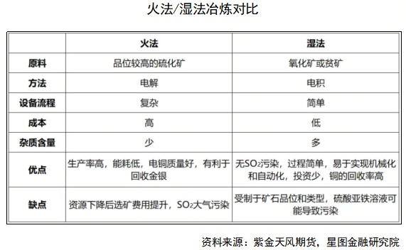废杂铜加工可成为再生精炼铜,而铜精矿冶炼可成为原生精炼铜。铜精矿冶炼主要采用火法冶炼和湿法冶炼,其中火法冶炼是主要炼铜工艺,2021年全球火法炼铜产量占总产量82%,火法冶炼可以粗略地分为“粗炼”和“精炼”两步,粗炼:铜精矿—冰铜—粗铜,精炼:粗铜—阳极铜—精炼铜。废杂铜既可作为原料加入火法冶炼环节以调节炉温、提高产量,也可在后续加工中直接用于制杆等环节来降低成本。