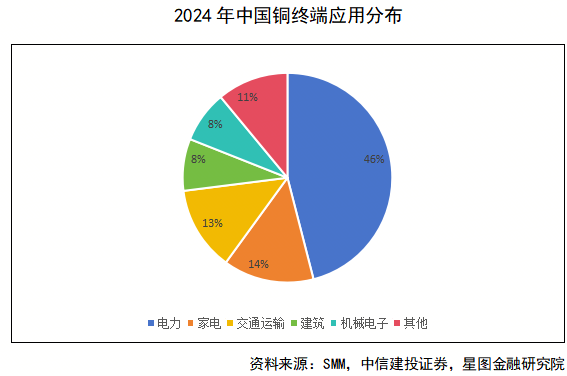 铜是建筑业和制造业中重要的基础原材料。凭借优异的导电、导热性能及延展性,铜的应用从电力、建筑等传统支柱,快速扩展到新能源、AI数据中心等新兴领域。根据Wood Mackenzie数据,从全球终端应用结构看,电网占比29%,建筑占比25%、消费品占比21%、交通运输占比14%、工业占比11%。当前中国的精炼铜消费占比超过57%,是全球最大的铜消费国,由于还处于工业化和城镇化的中高速增长阶段,终端应用结构相较全球而言更为集中,其中电力用铜占比高达46%,家电、交通运输、建筑、机械电子分别占14%、13%、8%、8%,其他项目合计占比11%,展现出与全球市场既关联又迥异的消费特征。