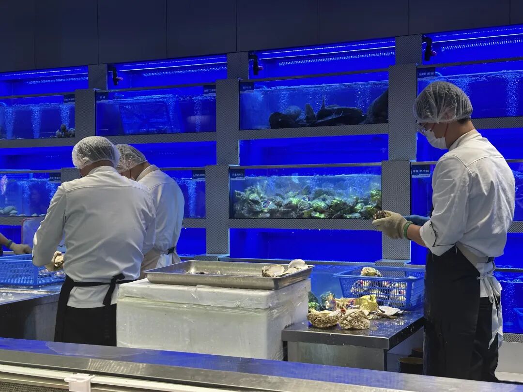 选餐区与食材处理区相连,形成一个开放透明的“前店后厂”布局,师傅从海鲜池里现捞鲜活海鲜,现场处理后立即上架,牛肉也是门店现切,整个加工过程一目了然。