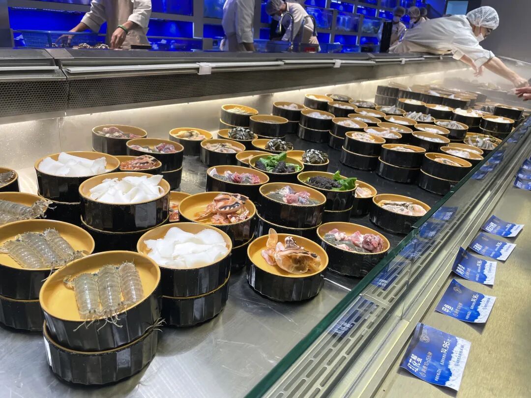 SKU虽多,但门店动线清晰。消费者从电梯出来直走就是选餐区,一条直线贯穿各个档口,能够穿梭在不同档口间自主挑选,像在逛海鲜市场一样有参与感。