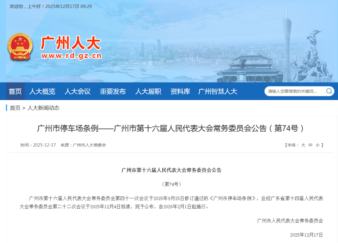 广州市十六届人大常委会第四十一次会议修订通过的《广州市停车场条例》(下称《条例》),经省十四届人大常委会第二十二次会议批准,将于2026年2月1日起施行。