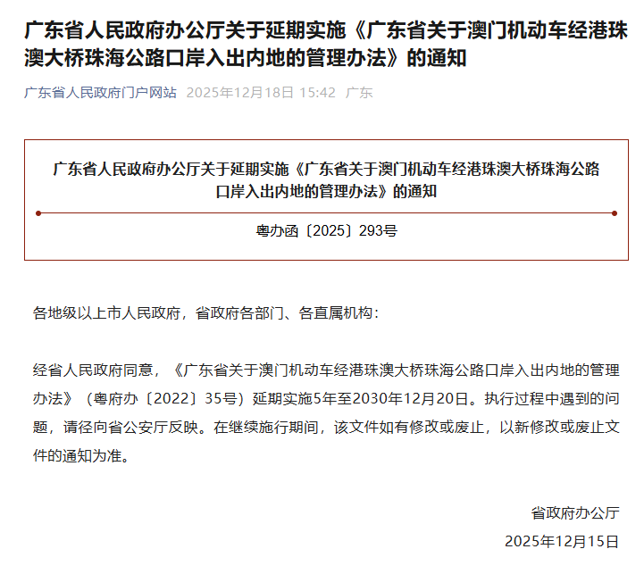 12月18日,广东省人民政府办公厅发布通知称,《广东省关于澳门机动车经港珠澳大桥珠海公路口岸入出内地的管理办法》至今三年期满后,将延期实施5年至2030年12月20日。