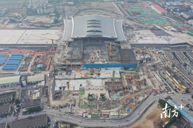 位于禅城区城北片区的佛山站项目现场,大型吊机挥舞长臂、施工车辆来回穿梭,一派热火朝天的施工景象。