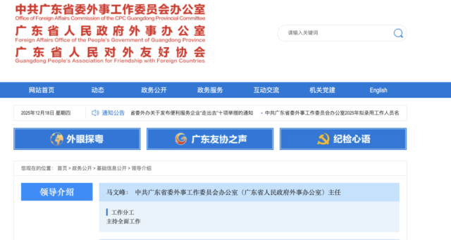 据中共广东省委外事工作委员会办公室官网显示,马文峰已任中共广东省委外事工作委员会办公室(广东省人民政府外事办公室)主任,负责主持全面工作。