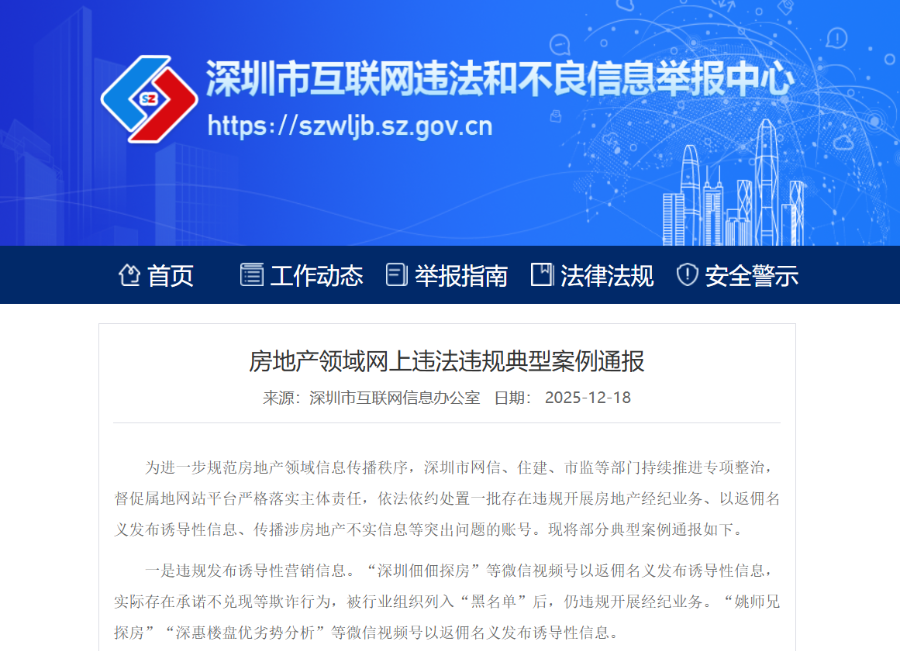 12月18日,记者从深圳市互联网信息办公室获悉,为进一步规范房地产领域信息传播秩序,深圳市网信、住建、市监等部门持续推进专项整治,督促属地网站平台严格落实主体责任,依法依约处置一批存在违规开展房地产经纪业务、以返佣名义发布诱导性信息、传播涉房地产不实信息等突出问题的账号,并通报了部分典型案例。