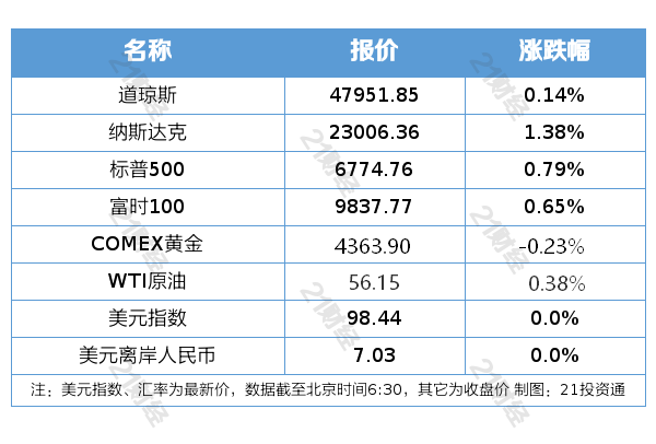 纽约股市三大股指12月18日上涨。截至当天收盘,道琼斯工业平均指数比前一交易日上涨65.88点,收于47951.85点,涨幅为0.14%;标准普尔500种股票指数上涨53.33点,收于6774.76点,涨幅为0.79%;纳斯达克综合指数上涨313.04点,收于23006.36点,涨幅为1.38%。