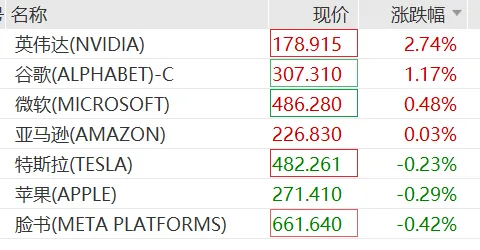 科技七巨头多数上涨,英伟达涨超3%,微软、谷歌、特斯拉、亚马逊小幅上涨。