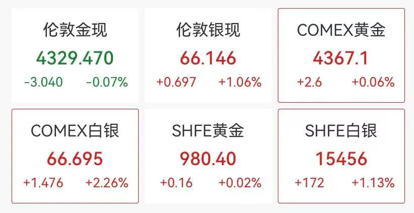 国际贵金属方面,黄金白银走势分化,现货黄金小幅下跌,在4330美元/盎司附近震荡,反观现货白银短线拉升,站上66美元/盎司上方,日内涨超1%。