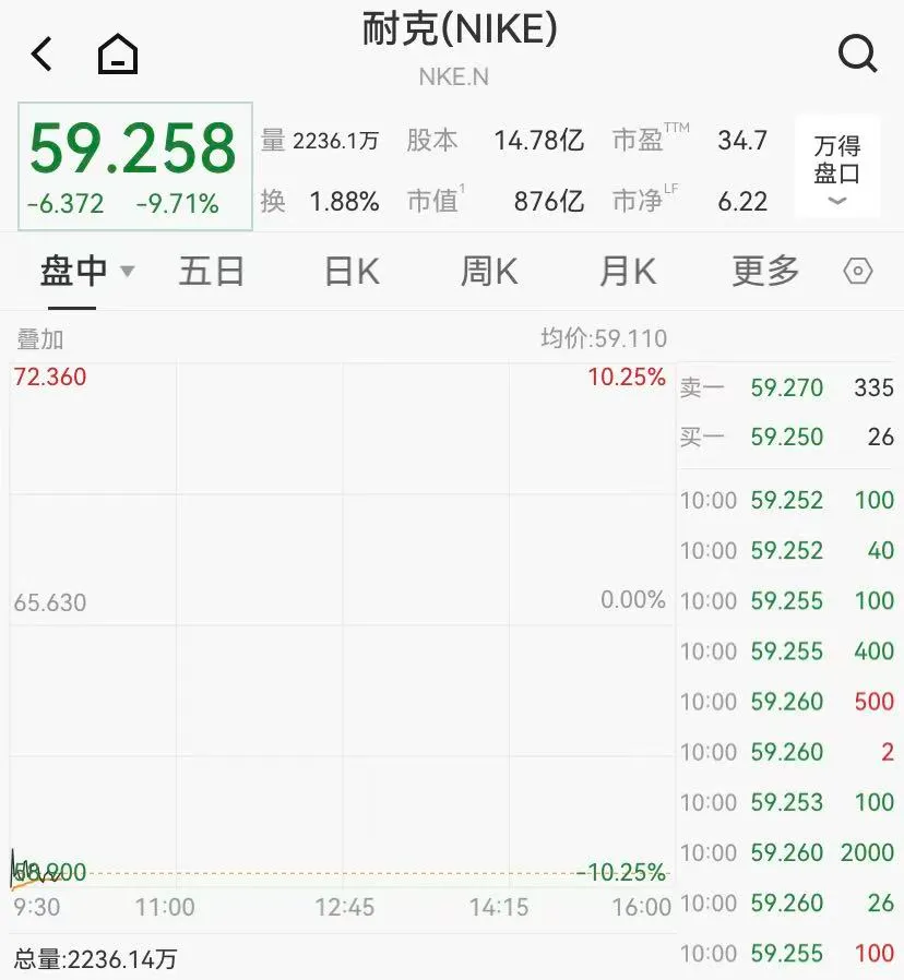 知名个股方面,体育用品巨头耐克的股价开盘大跌,现大跌近10%,创下今年4月以来新低。