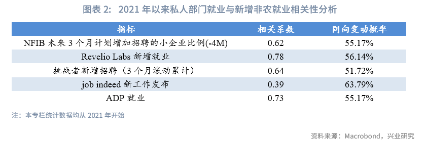 从总体相关系数与同向变动概率来看,五个私人部门就业指标与新增非农就业都具有较好的相关性,其中Revelio Labs新增就业相关系数最大,job indeed新工作发布同向变动概率最大,挑战者新增招聘同向变动概率最小。分年度来看,各指标与新增非农就业关系并不稳定。