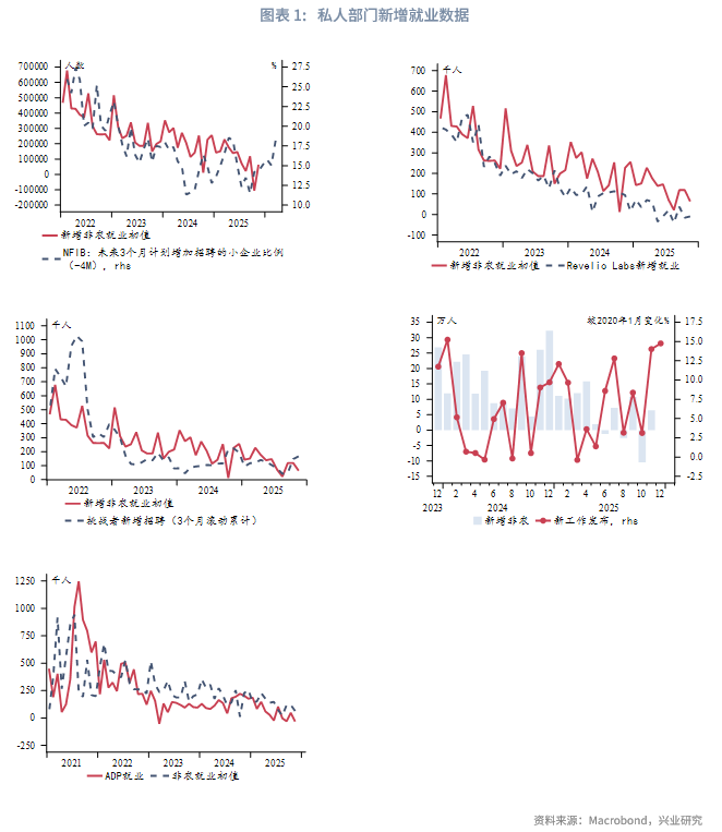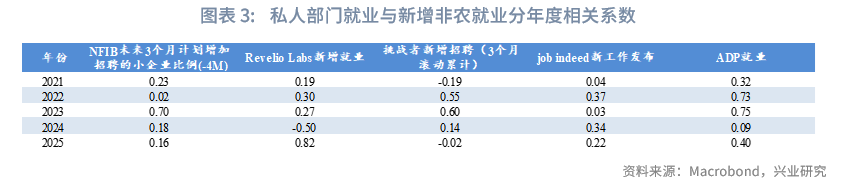 新增非农就业人数方面,目前有五个私人部门指标可以反映,分别为:ADP就业、NFIB中小企业招聘计划、Revelio Labs预测就业人数、“挑战者”新增招聘人数、Job Indeed新工作发布。正常情况下,上述指标公布时间均领先非农就业初值公布1到2天。而在美国政府关门导致官方数据缺失期间,私人部门数据则能够对非农就业数据提供一定指引。本专栏我们探究私人部门数据与新增非农就业数据关系,并尝试融合指标对非农就业方向进行提前预判。