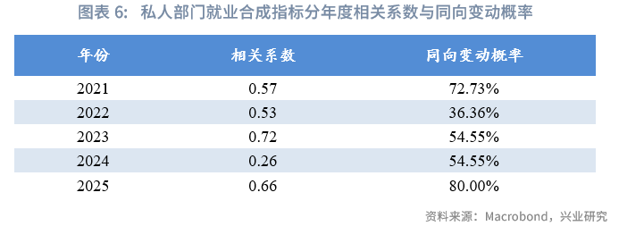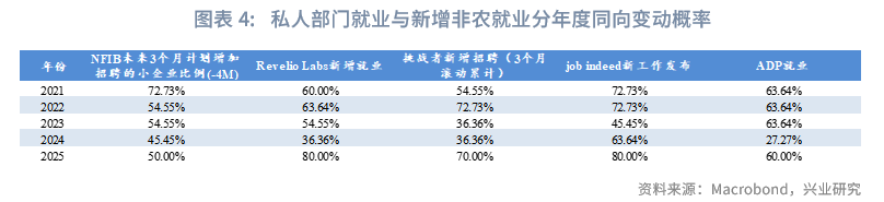 专栏:私人部门就业指标对新增非农就业数据有一定指向性。分年度来看,各指标与新增非农就业关系并不稳定。我们将NFIB中小企业招聘计划、Revelio Labs新增就业、job indeed新工作发布、ADP就业四个指标合成,合成指标与新增非农就业相关系数0.85,同向变动概率58.62%。