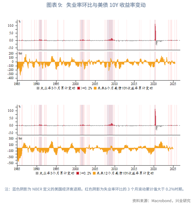 失业率边际回升,降息迫切性增强。近3个月美国失业率从8月的4.3%进一步攀升至4.6%,边际回升0.3%。从历史经验看,经济衰退时失业率会非线性恶化,若失业率环比的3个月滚动累计值大于0.2%便是需要警惕的信号。结合本次公布的数据,自9月以来(实际数据11月公布)已经连续3个月发出预警。进一步统计历史上失业率触发预警后未来6个月、12个月联邦基金利率的累计变动幅度。数据显示,在失业率触发预警后,未来6个月、12月美联储大多采取降息操作。自上世纪80年代中后期通胀重新锚定以来,在未发生经济衰退、仅失业率触发预警的情况下,未来6个月、12个月美联储的累计降息幅度通常达到50bp~150bp;未来6个月、12个月美债10Y的最大下行幅度通常达到40bp~130bp。这明显高于12月美联储点阵图中值降息25bp。据此,我们维持此前的判断:2026年美联储将有2~3次(50~75bp)降息,且上半年降息的可能性更大。虽然当前市场预期2026年有50bp降息,但预期的降息时点靠后(最早4月和7月)。若就业市场持续面临压力,同时通胀边际回落,将促使市场降息预期逐渐前置。届时将带动美债收益率出现下行波段。