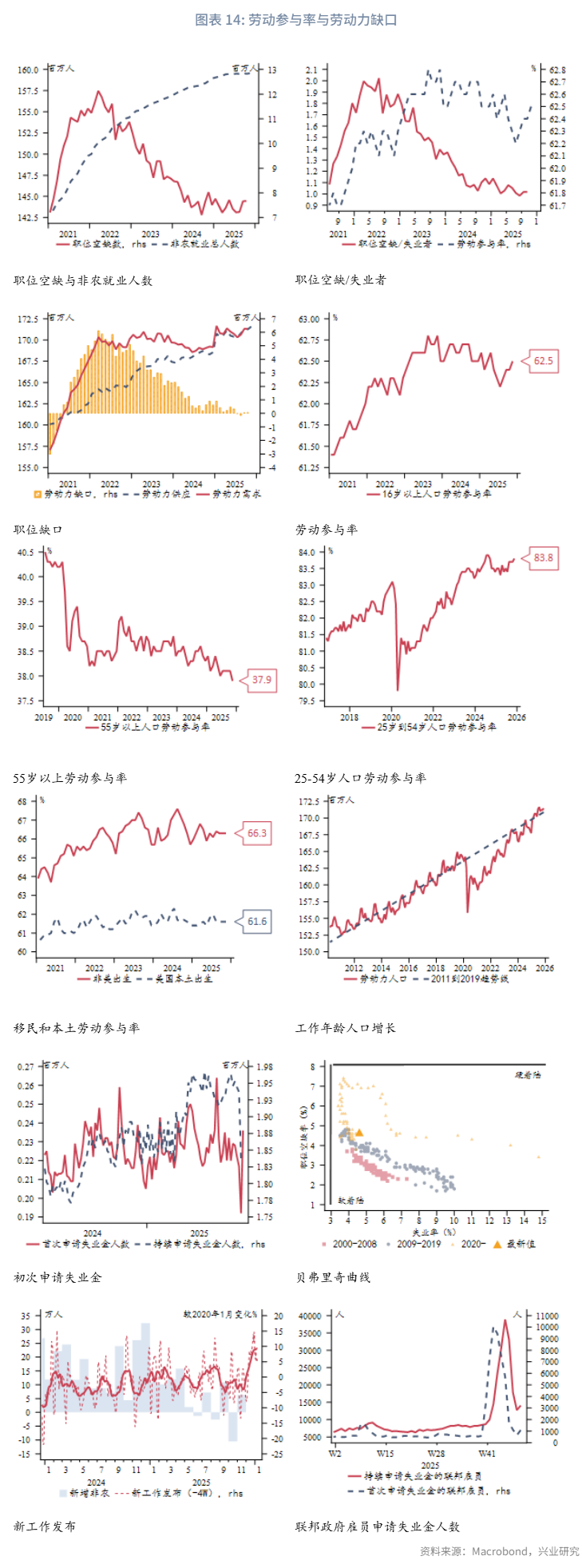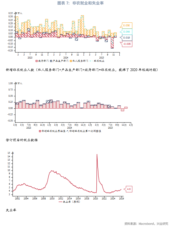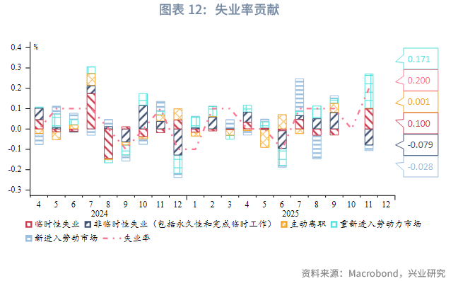 11月新增非农就业6.4万人好于预期,但失业率升至4.6%(2021年9月以来最高),时薪增速放缓。市场呈现“招聘放缓+劳动参与率回升”的组合,导致失业率上升。服务业仍是主引擎但内部分化,教育医疗业支撑增长,而休闲住宿业就业转负可能预示消费走弱。产品生产部门中,建筑业表现亮眼,制造业整体疲软。失业率上升主要源于重新进入劳动力市场及临时性失业(受政府停摆影响),而非临时性失业贡献为负,表明尚未出现大规模裁员潮。劳动参与率回升至62.5%,主要受25-54岁年龄段人口推动。