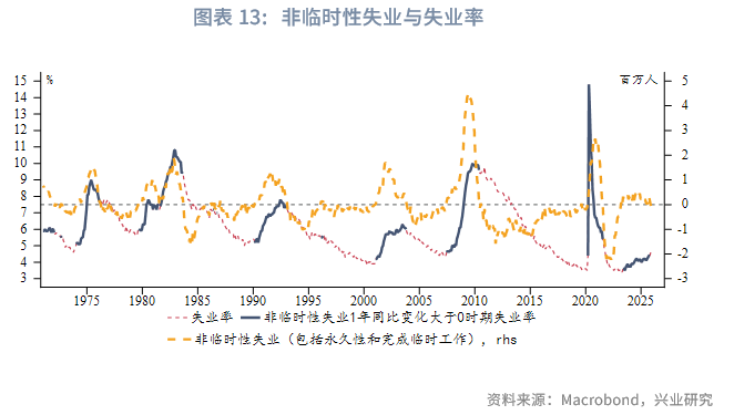 从失业原因看,失业率增加主要来自重新进入劳动市场和临时性失业。非临时性失业贡献为-0.079%。其中,临时性失业主要受政府停摆影响,属于一次性冲击。积极角度看,当前并未出现裁员潮,劳动力市场底盘相对稳定。但值得注意的是,重新进入劳动市场人数增加,可能是随着通胀和储蓄耗尽,更多人被迫出来找工作。