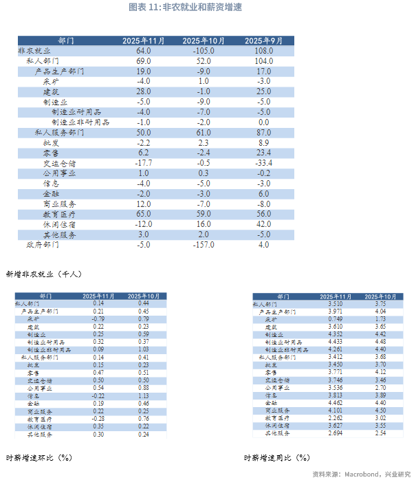 服务部门仍是主引擎但内部分化加剧,少数行业支撑大局(教育医疗)。其中休闲住宿业作为前期消费韧性的象征,11月新增就业转为减少1.2万人,相较9月大幅回落,可能预示消费者开始削减可选服务支出。运输仓储业10-11月平均每月减少0.9万人。反映物流活动放缓、库存调整,是商品消费和工业生产疲软的连带体现。