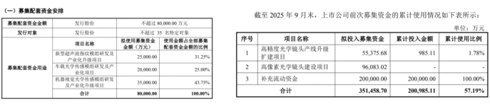 公司本次拟询价发行股份募集配套资金不超过8亿元,将全部用于以下三个募投项目的建设。需要指出的是,欧菲光于2021年9月通过定增共募资35.3亿元,其中20亿元已补流,其余投入高像素光学镜头建设项目(以下简称项目一)。