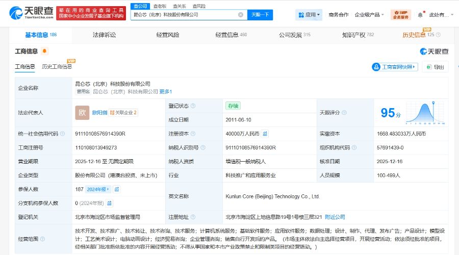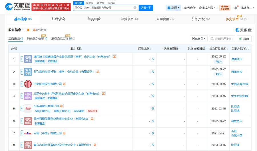 昆仑芯(北京)科技股份有限公司成立于2011年6月,法定代表人为欧阳剑,经营范围含计算机系统服务、基础软件服务、应用软件服务、数据处理、产品设计、模型设计、经济贸易咨询、企业管理咨询等。股东信息显示,该公司由百度(中国)有限公司、通用技术高端装备产业股权投资(桐乡)合伙企业(有限合伙)、比亚迪(002594.SZ)等共同持股。