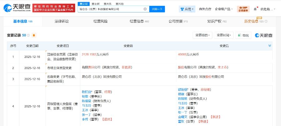 天眼查工商信息显示,近日,昆仑芯(北京)科技有限公司发生工商变更,企业名称变更为昆仑芯(北京)科技股份有限公司,注册资本由约2128万元人民币增至4亿元人民币,增幅约1780%,同时,部分高管也发生变更。