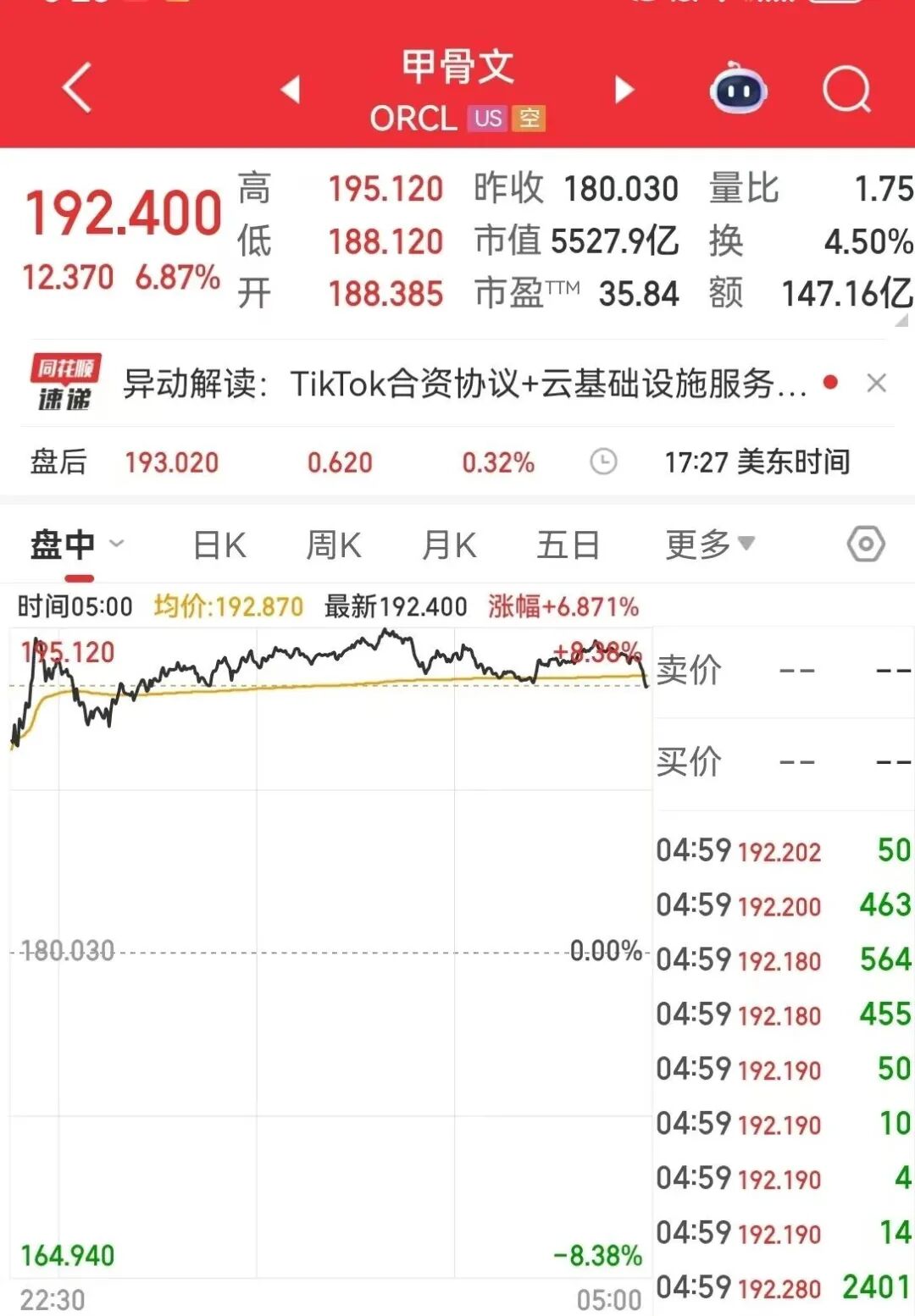 甲骨文股价上涨6.6%。消息面上,据财联社消息,TikTok已与三家投资者签署协议,并将成立新的TikTok美国合资公司,该合资公司包括甲骨文公司、银湖资本及MGX。