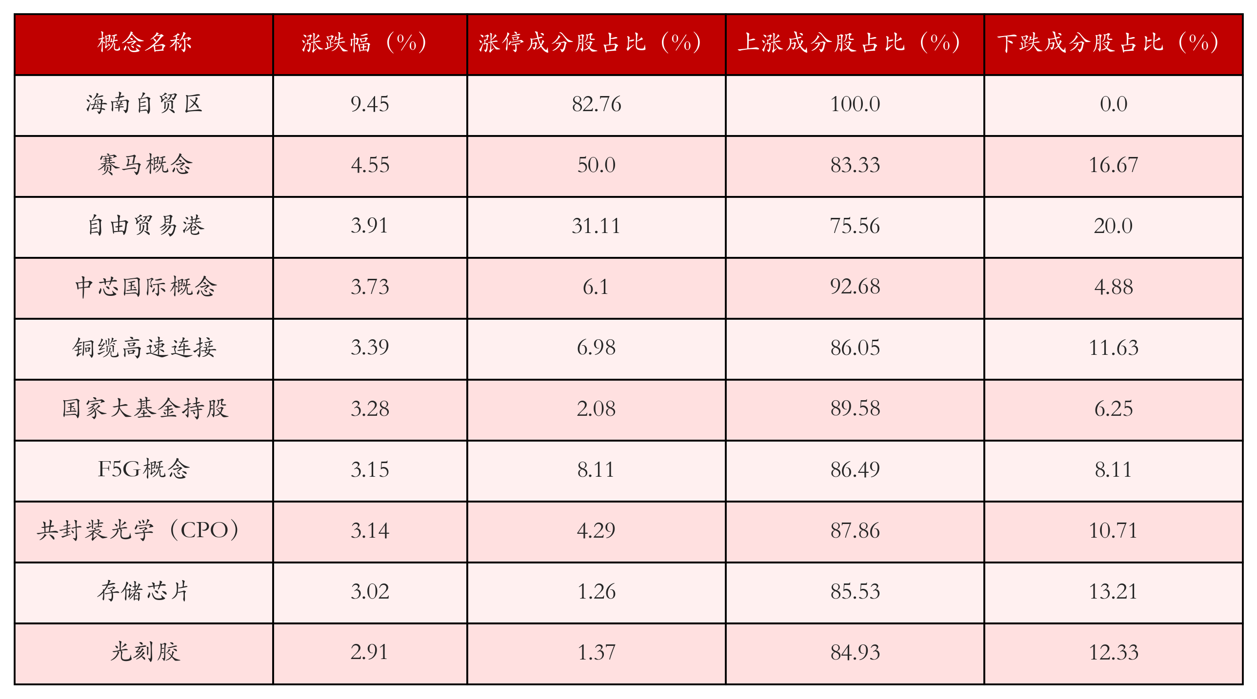 根据A股概念涨跌幅与所对应的股票池综合分析,涨幅靠前的三个概念板块分别为:海南自贸区、赛马概念与自由贸易港。排名前10位的概念板块相关数据见下表: