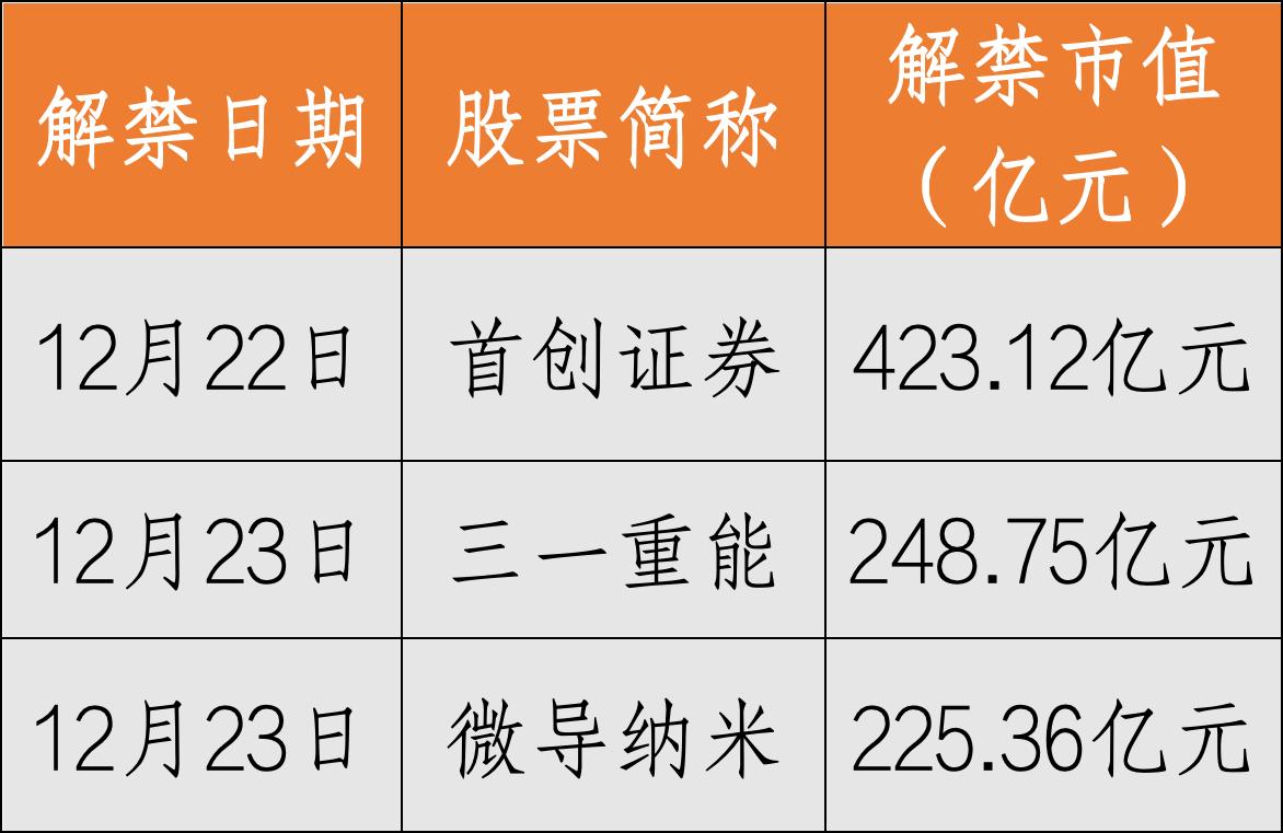 本周A股将有49家上市公司解禁限售股,共解禁209.88亿股,合计解禁市值为1881.62亿元。从限售股解禁市值来看,排名前三的为:首创证券(423.12亿元)、三一重能(248.75亿元)、微导纳米(225.36亿元),解禁股份类型均为首发原股东限售股份。