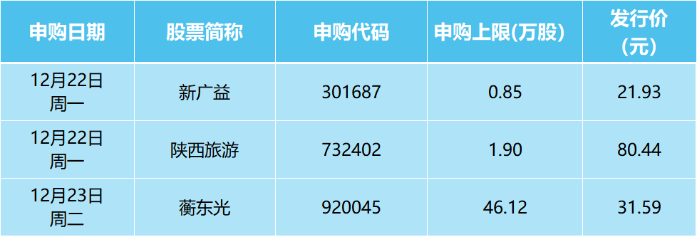 本周共有3只新股申购,分别为新广益(深交所创业板)、陕西旅游(上交所主板)、蘅东光(北交所)。