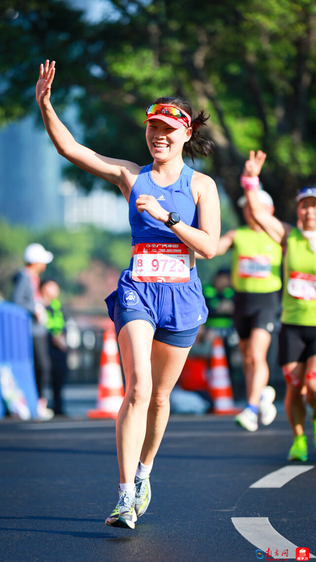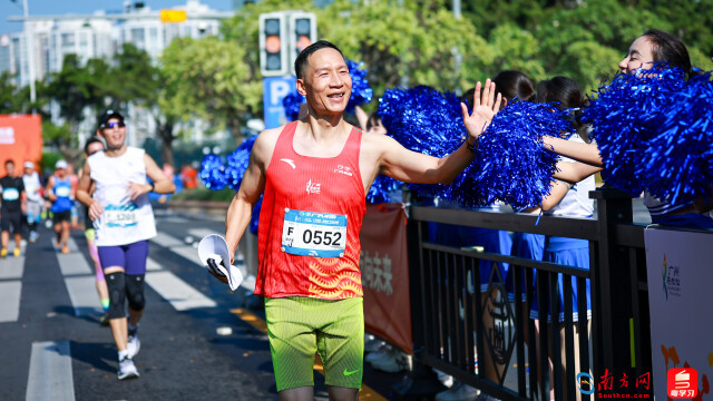 2025广州马拉松,选手和啦啦队互动。摄影:曹雅琴