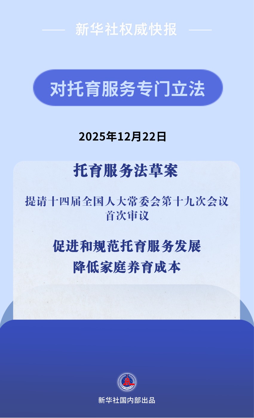 12月22日,托育服务法草案提请十四届全国人大常委会第十九次会议首次审议。草案共8章76条,包括总则、托育机构、托育人员、服务提供、保障措施、监督管理、法律责任和附则。