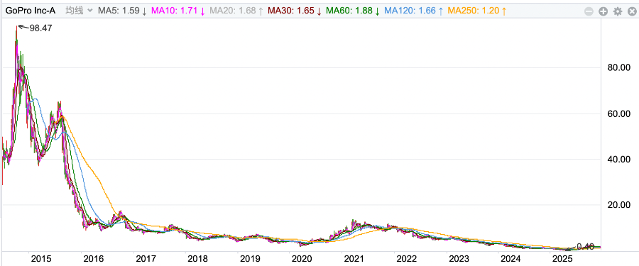 最新的2025年三季度财报显示,GoPro已连续多个季度亏损,且仍在扩大。其股价也长期低迷,甚至一度成为被散户炒作的“迷因股”,与基本面严重脱钩。截至12月19日,GoPro报价1.59美元/股,曾经130亿美元的帝国,总市值仅余2.54亿美元。