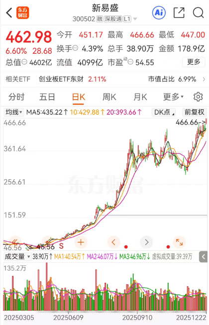 12月22日早盘,光模块跳空大涨,板块指数再创历史新高。值得一提的是,新易盛早盘一度大涨超7%,刷出466.66元的历史新高价,这和4月9日盘中触及的46.56元相比,年内已完成股价10倍的壮举。