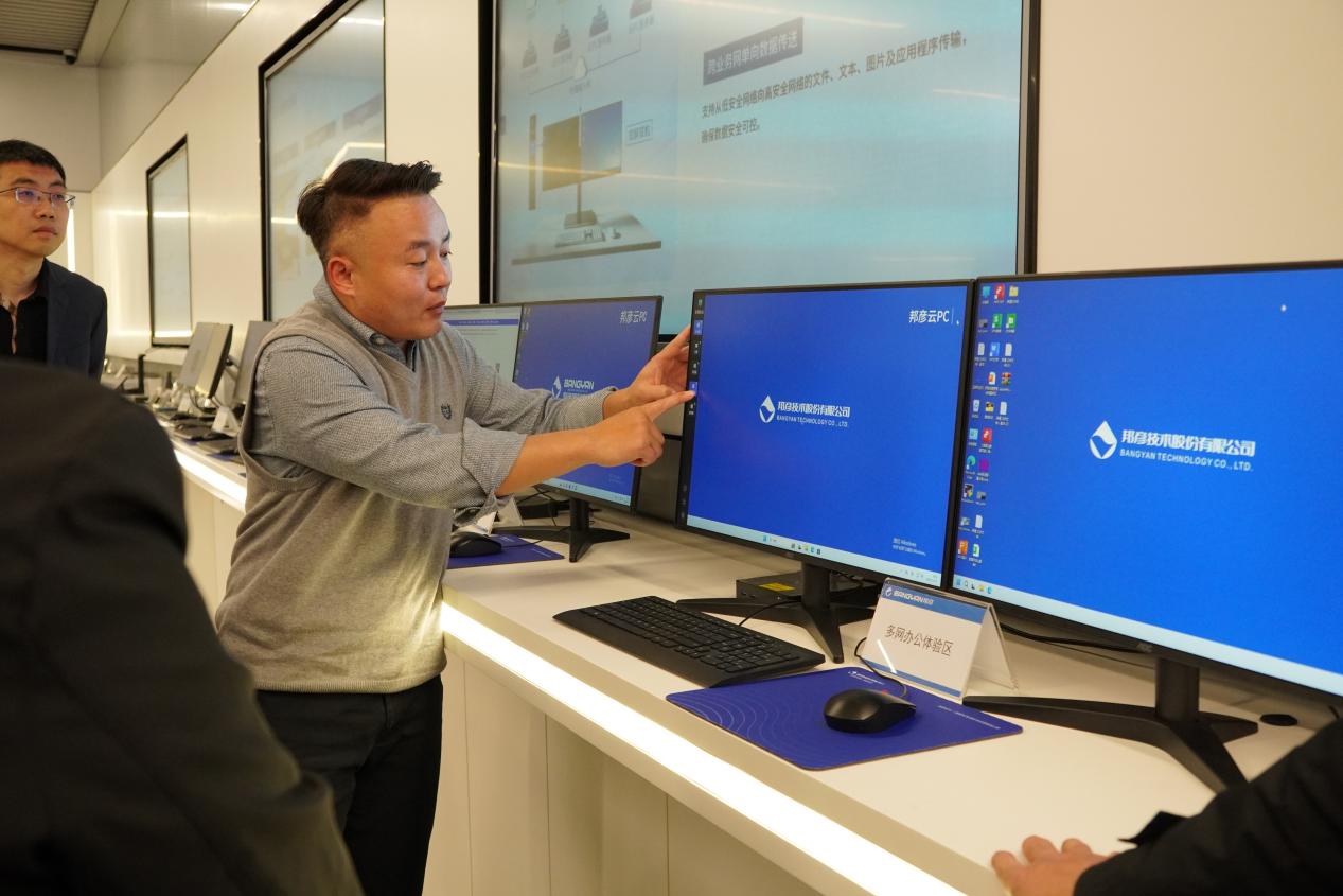 座谈结束后,投资者移步邦彦科技展会场所,开启实地参访之旅。在龙淼的带领下,投资者首先回顾了企业的发展沿革,从创立初心到关键成长节点,深刻感受企业的发展底蕴;随后,龙淼结合展台上的实物展品,对云 PC 业务进行针对性功能演示,通过金融、电力、政务领域的实际应用案例,直观展现产品的核心价值。在 AI 智能体产品展区,李海洋通过现场操作与案例展示,全方位介绍 “女娲 AI” 的技术优势,生动呈现其在电商直播等场景中的应用效果,让投资者近距离感受企业的技术硬实力。