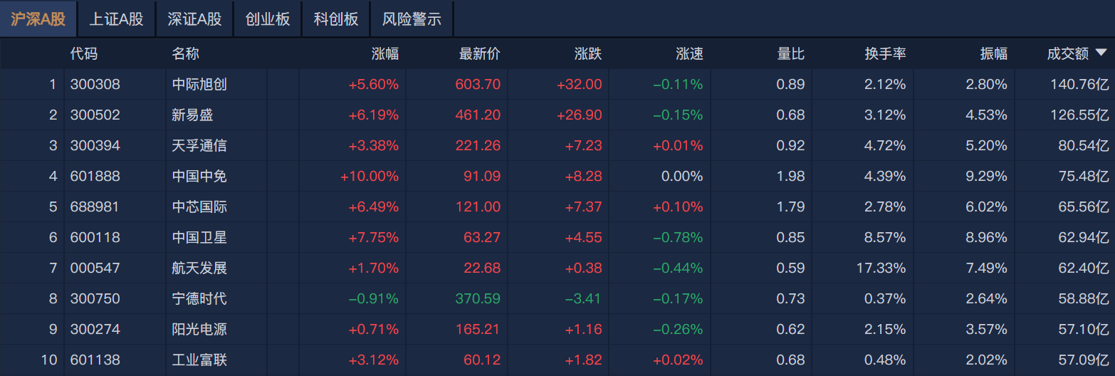 个股方面,中际旭创成交额超140亿元居首,新易盛、天孚通信、中国中免成交额靠前。