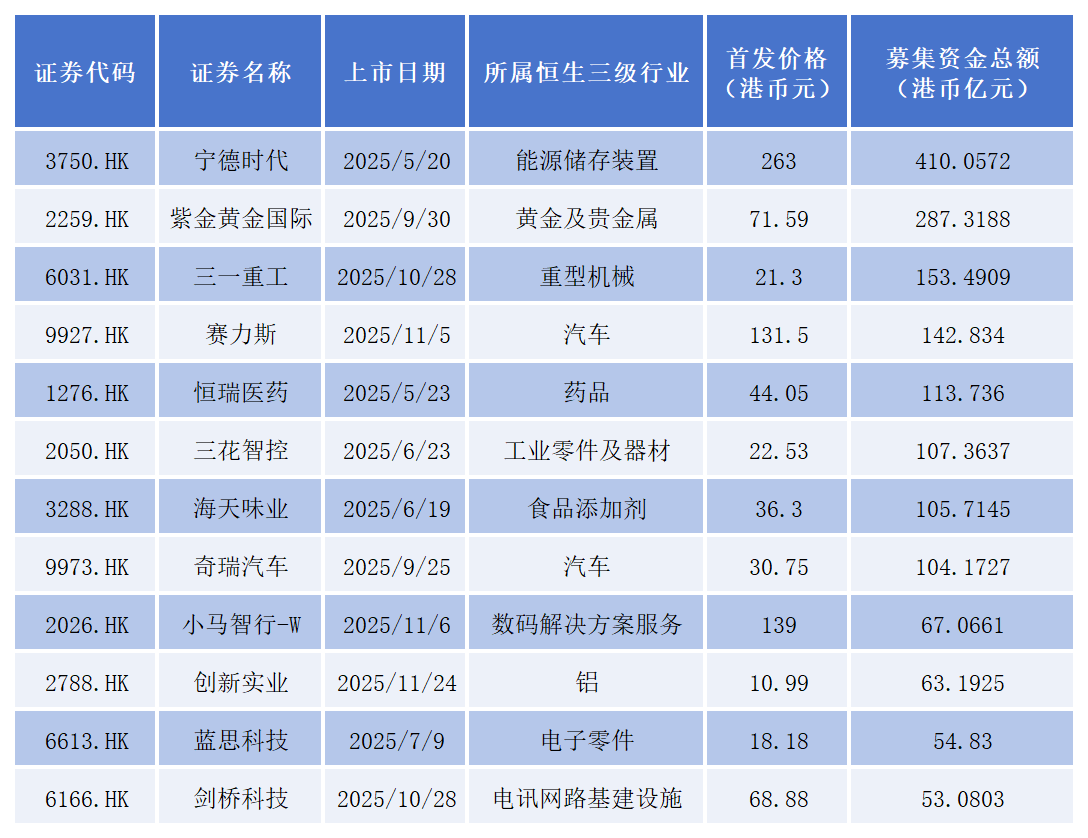 同花顺数据显示,在港股年内募资总额排名前十的公司中,宁德时代募资总额超过400亿港元,位居第一;紫金黄金国际、三一重工、赛力斯、恒瑞医药、三花智控、海天味业、奇瑞汽车的募资总额均超过100亿港元。