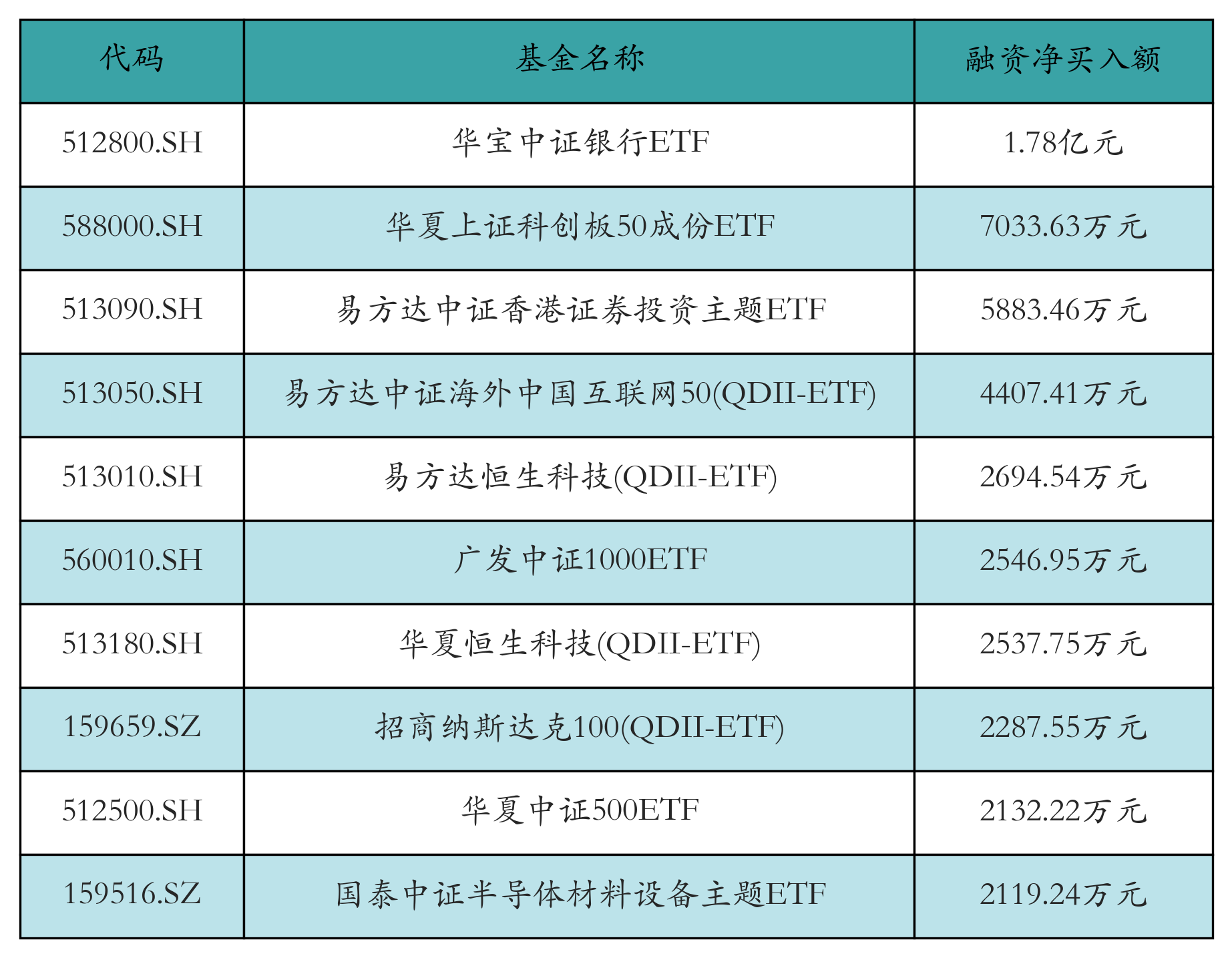 12月19日ETF融资净买入额前三位分别为:华宝中证银行ETF(1.78亿元)、华夏上证科创板50成份ETF(7033.63万元)和易方达中证香港证券投资主题ETF(5883.46万元),前10具体见下表:
