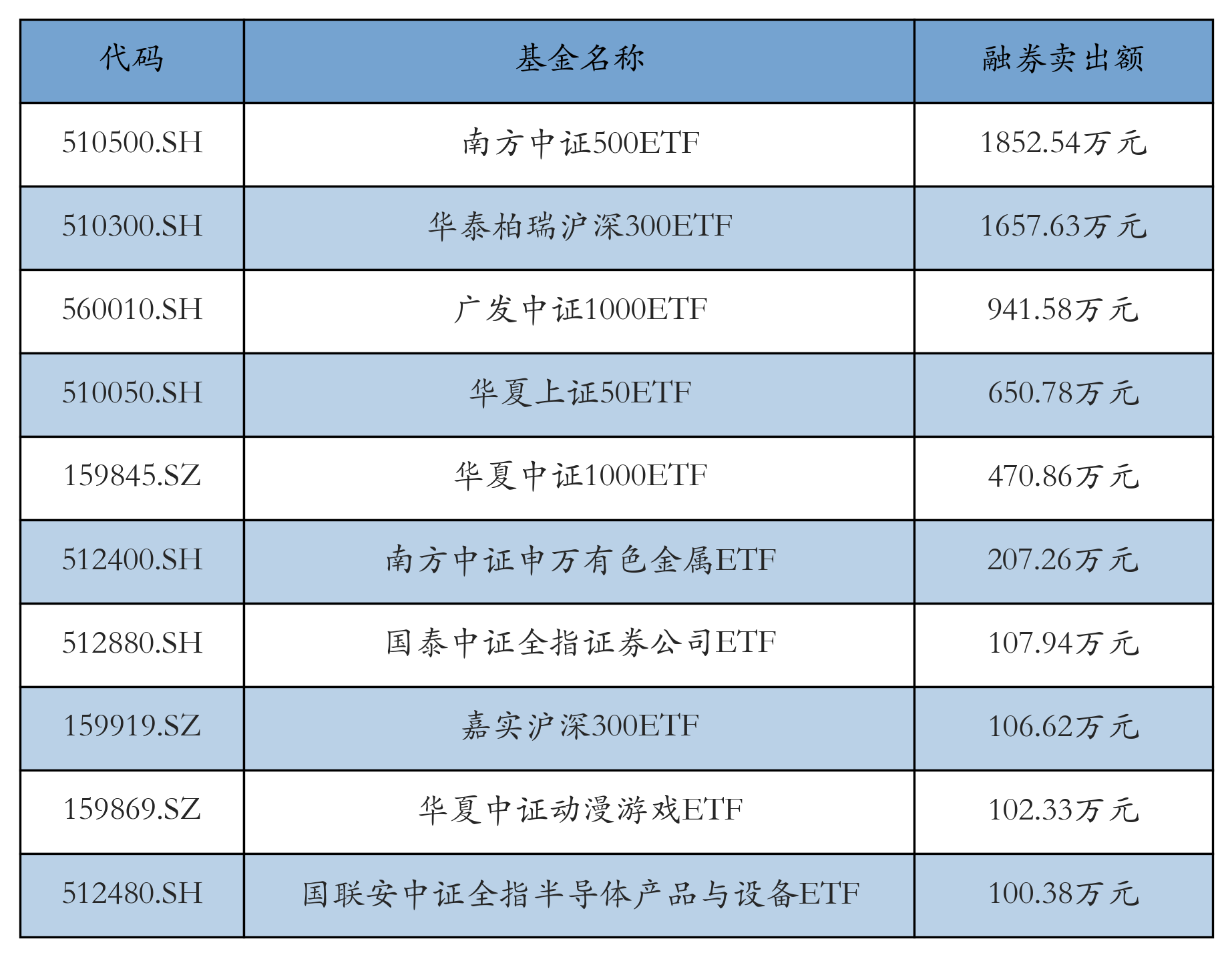 12月19日ETF融券卖出额前三位分别为:南方中证500ETF(1852.54万元)、华泰柏瑞沪深300ETF(1657.63万元)和广发中证1000ETF(941.58万元),前10具体见下表: