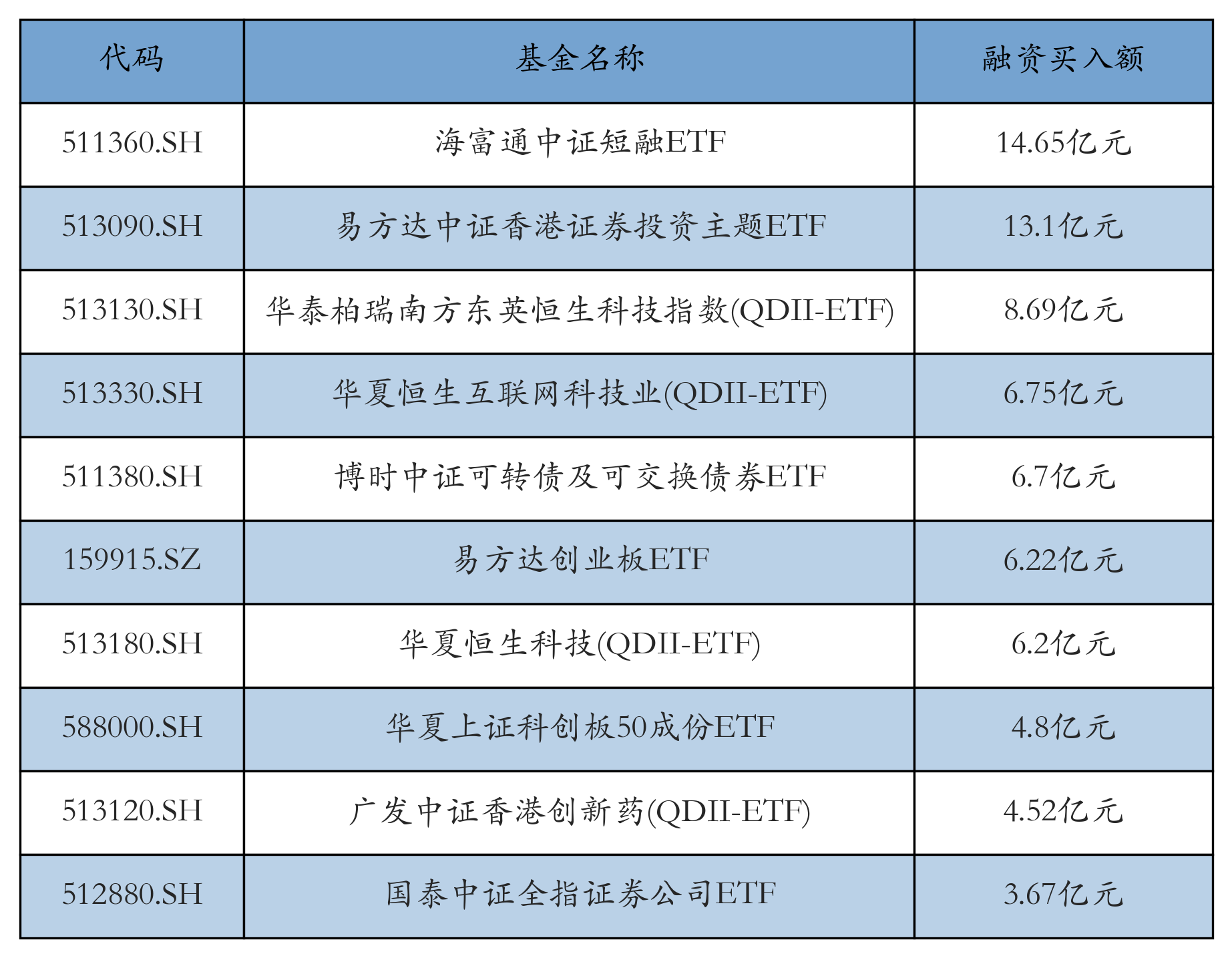 12月19日ETF融资买入额前三位分别为:海富通中证短融ETF(14.65亿元)、易方达中证香港证券投资主题ETF(13.1亿元)和华泰柏瑞南方东英恒生科技指数(QDII-ETF)(8.69亿元),前10具体见下表: