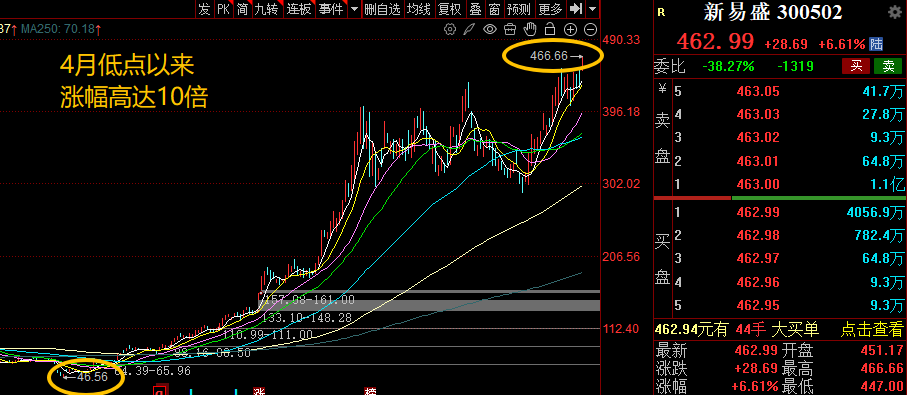 新易盛盘中股价一度涨至466.66元,再创历史新高。如果从4月9日盘中46.56元的最低价起算,短短8个多月时间,新易盛股价完成十倍行情,市值突破4600亿元大关。