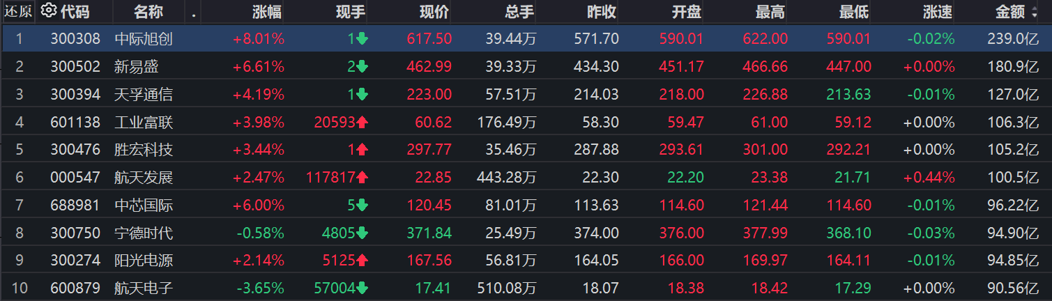 个股方面,中际旭创、新易盛、天孚通信成交额靠前。